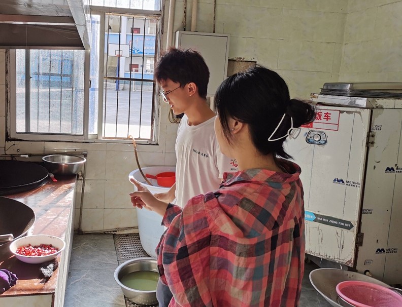 關于廚房用地,分為3塊區域,干濕分離,后廚位置鋪設瓷磚,用于備菜,處理,制作學生飯菜的空間。前廳就是教師吃飯的區域,剩余一塊空間就用作廚房儲存糧食物資,是一個簡小的倉庫。小組采訪了廚房阿姨,阿姨表示“這個小小的廚房,她們使用起來很方便,順手。幾個阿姨之間會分工合作,有條例的照顧好學生的伙食情況。”小小的廚房空間安排有序,使用便利。