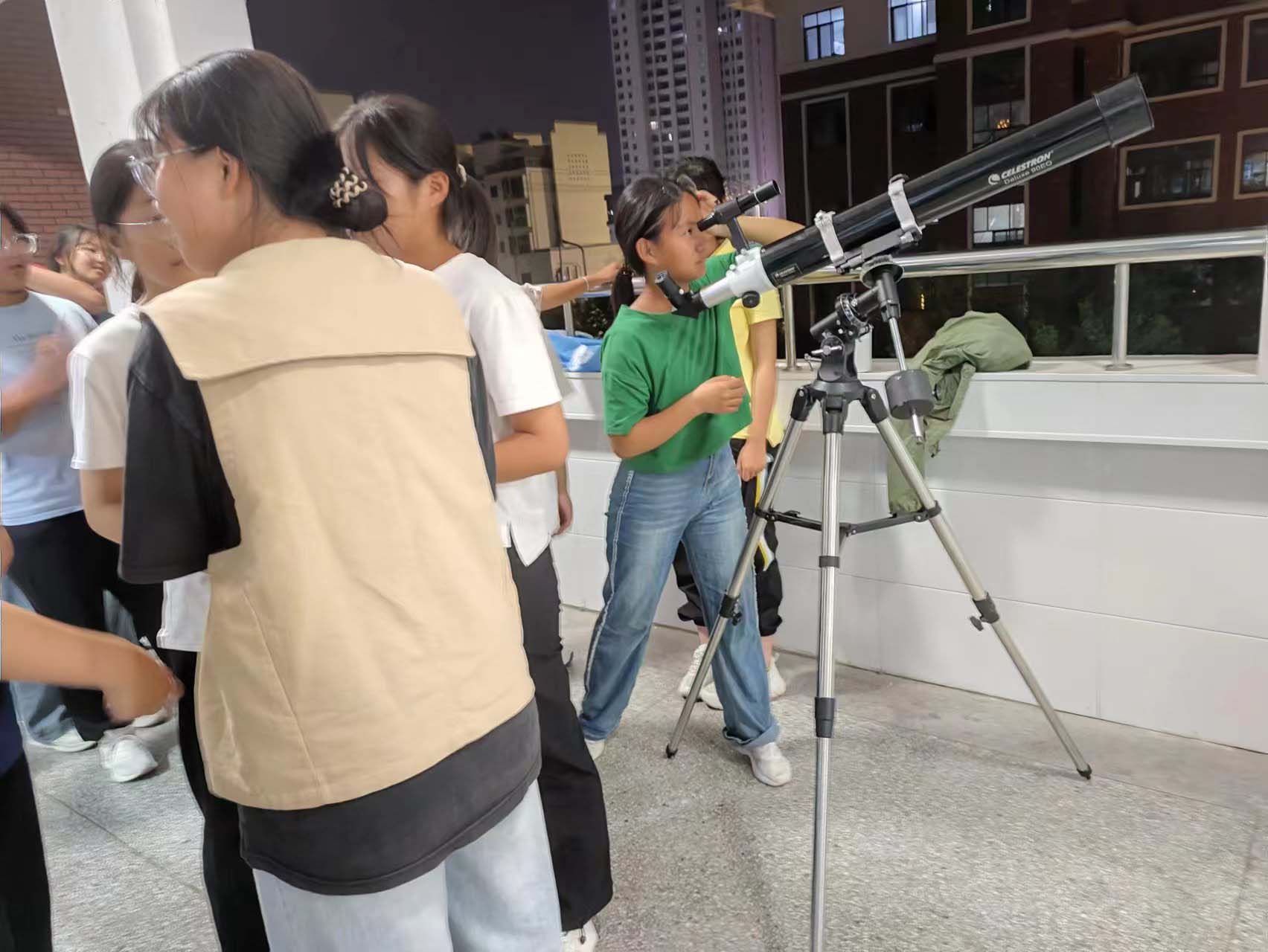 圖為同學(xué)們?cè)谟猛h(yuǎn)鏡觀(guān)測(cè)。