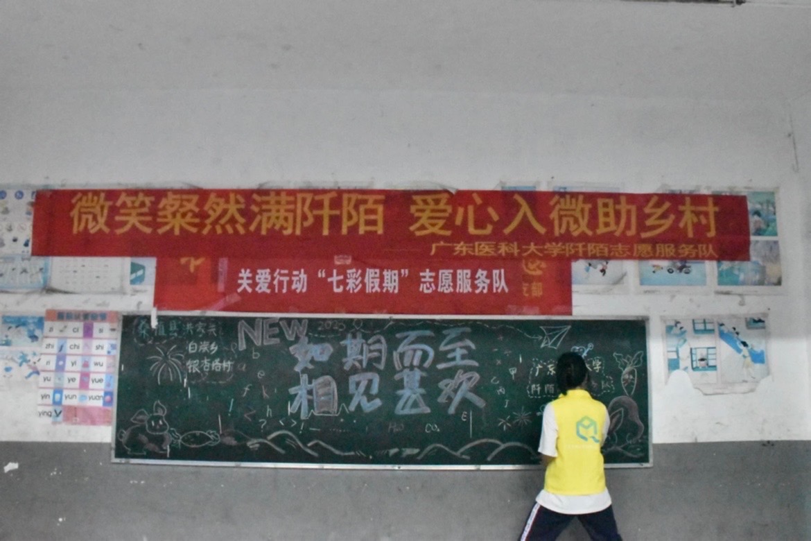 接著書記帶領(lǐng)我們來到我們未來十五天進(jìn)行義教的地點(diǎn):一間僅容二十來人的小教室。打開門的那一瞬間,一陣久未開封的煙塵味撲面而來。環(huán)顧四周,講臺(tái)上堆放著幾本讀物,屋內(nèi)僅有幾張小書桌,五星紅旗下的黑板上依稀寫著“振興鄉(xiāng)村我能行”“我愛學(xué)習(xí)”等字樣。一番收拾后,桌椅整齊地排列著,地面拖得一塵不染,黑板上用紅藍(lán)粉筆寫著“如期而至,相見甚歡”,教室變得煥然一新。望著此番畫面,盡管未能與小朋友們見面,但我已迫不及待地期待起與大家見面的場(chǎng)景。