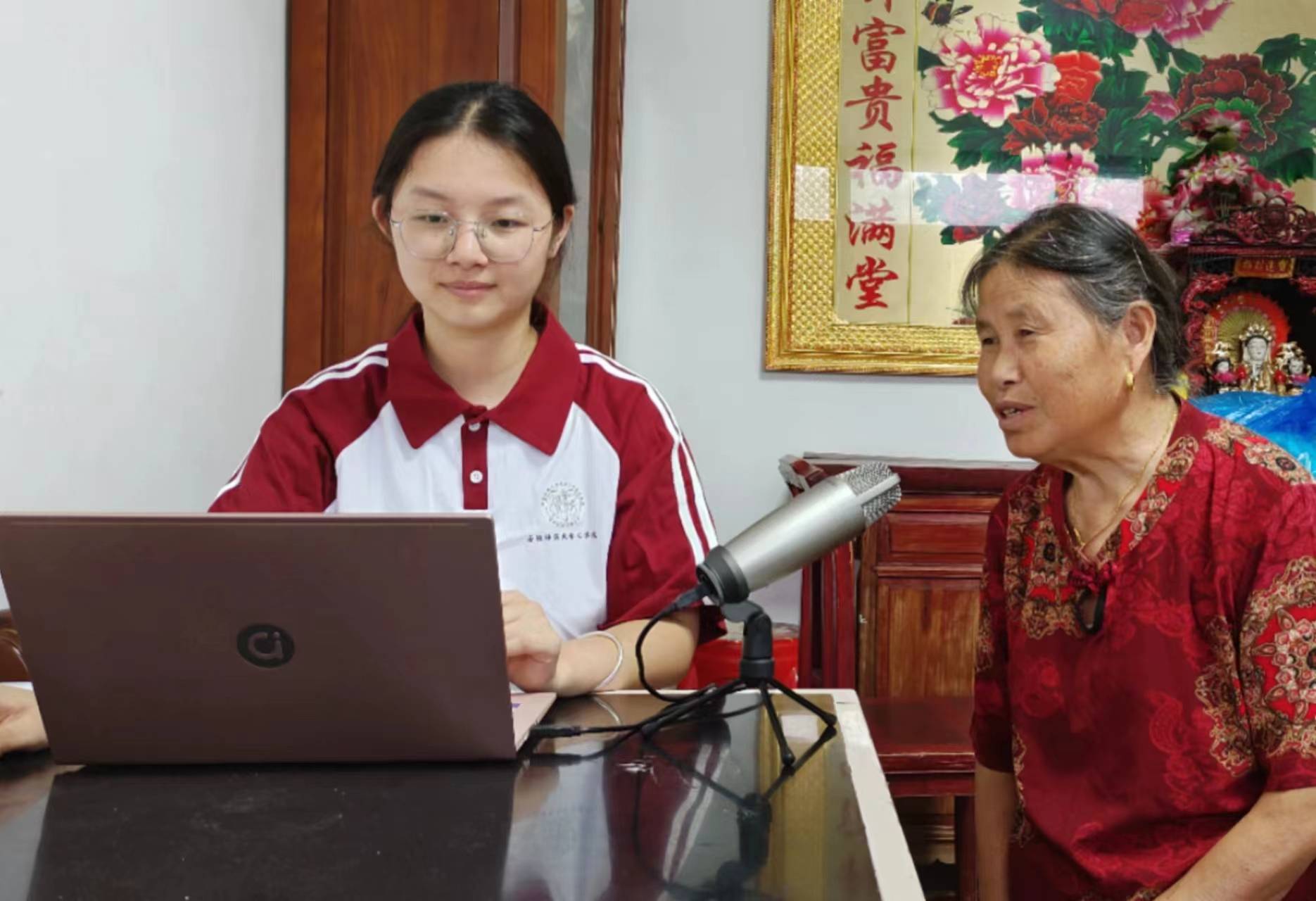圖為團隊成員采訪旌德縣版書鎮村委委員郭海芳,郭海芳委員向我們講述版書鎮活字印刷術的歷史和王禎的故事。