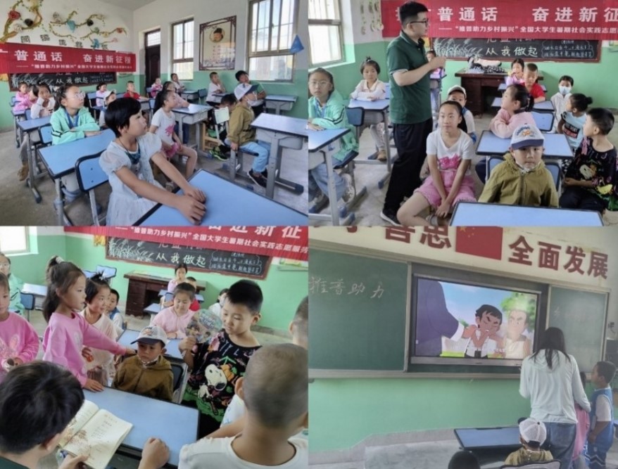 大學生實踐團隊為小學生們籌備了一節生動有趣的推普課。通過講解生活中的用電安全小常識,大學生們為小朋友普及用電安全知識、講解常用工具的正確發音;以經典詩文朗誦引導學生正確發音、學習傳統經典;組織開展紅色動畫作品配音大賽,激發學生的愛國熱情、培養普通話使用習慣。并通過“擊鼓傳花:我用普通話講故事”小游戲,激發小學生學習使用國家通用語言文字的熱情和興趣。
