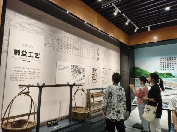 馬岙自古以來就是舟山主要產鹽地,始于夏商,盛于唐宋,清道光初為板曬,直到解放后改灘曬,鹽民才擺脫“一擔鹽,百擔泥”的勞苦制鹽方式,進入科學曬鹽的新時期。從海鹽生產工藝發展史中,調研團成員們明白了科學利用先進生產工藝才能減輕鹽民的勞動強度和提高生產效率。