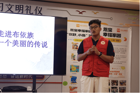 圖為團(tuán)隊(duì)成員楊佳同學(xué)為小朋友們講解有關(guān)布依族的民族課程
