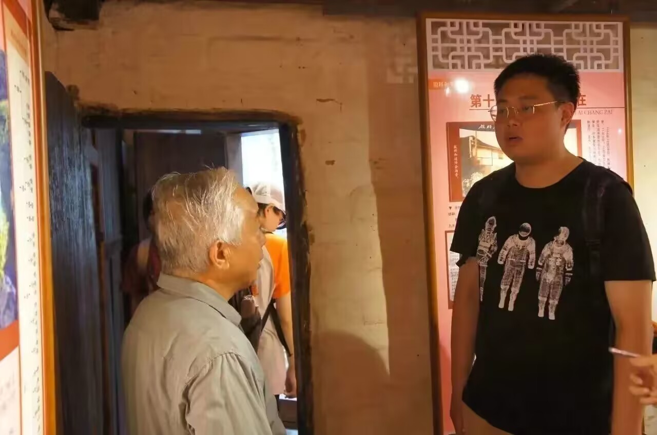 圖為殷詩東爺爺在給陳鵬飛老師講解粹和生平 安徽師范大學 余文藝 攝