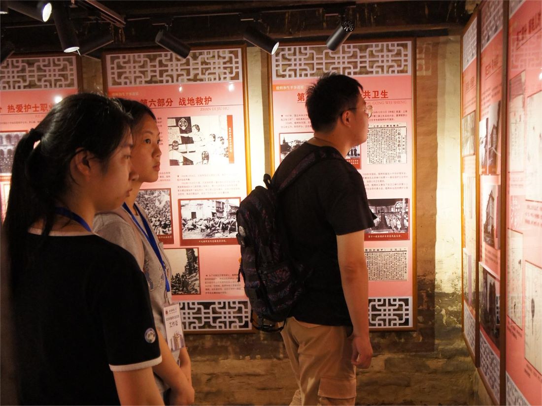 圖為學生在觀看殷粹和生平展板 安徽師范大學 劉靜嫻 攝