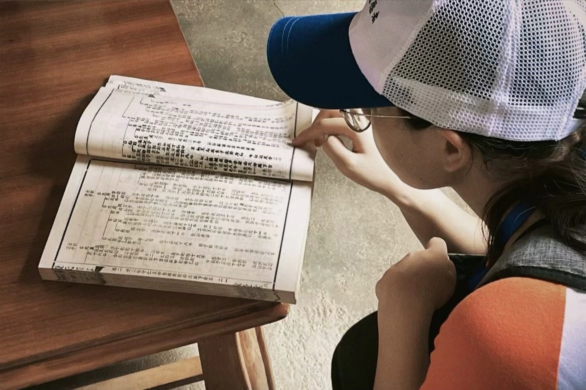 圖為史靜同學翻閱殷氏族譜尋找粹和傳記 安徽師范大學 郭悅悅 攝