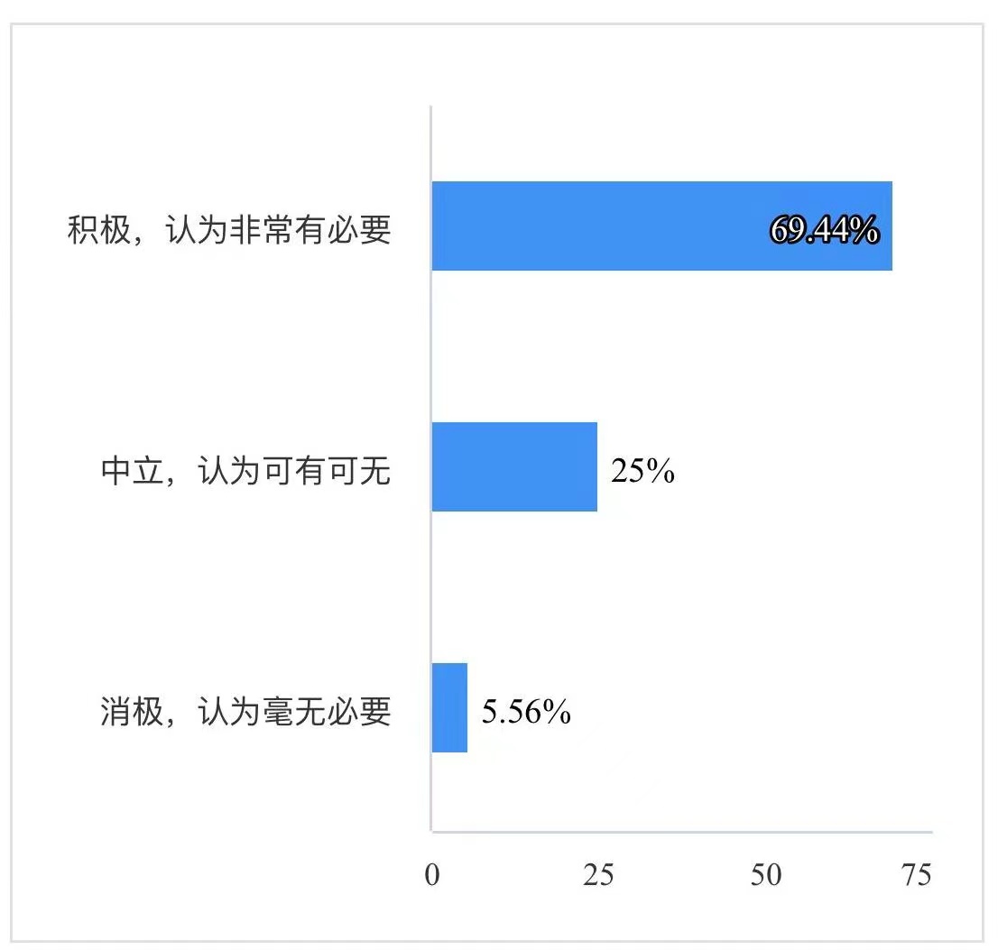 如圖所示69.44%的居民認為進行垃圾分類行動是有必要的,而25%的居民則保持中立態度,認為其可有可無,更有5.56%的居民秉持消極態度,完全意識不到垃圾分類的意義所在。針對上述結果,團隊成員應做出有效舉動爭取“中間勢力”,讓保持中立態度的群眾理解垃圾分類的過程,明確垃圾分類的意圖。對于那些少數的“頑固勢力”,團隊成員應極具耐心向其宣傳垃圾分類教育與影響,從思想上感化他們做出改變,成為垃圾分類行動中的一員。