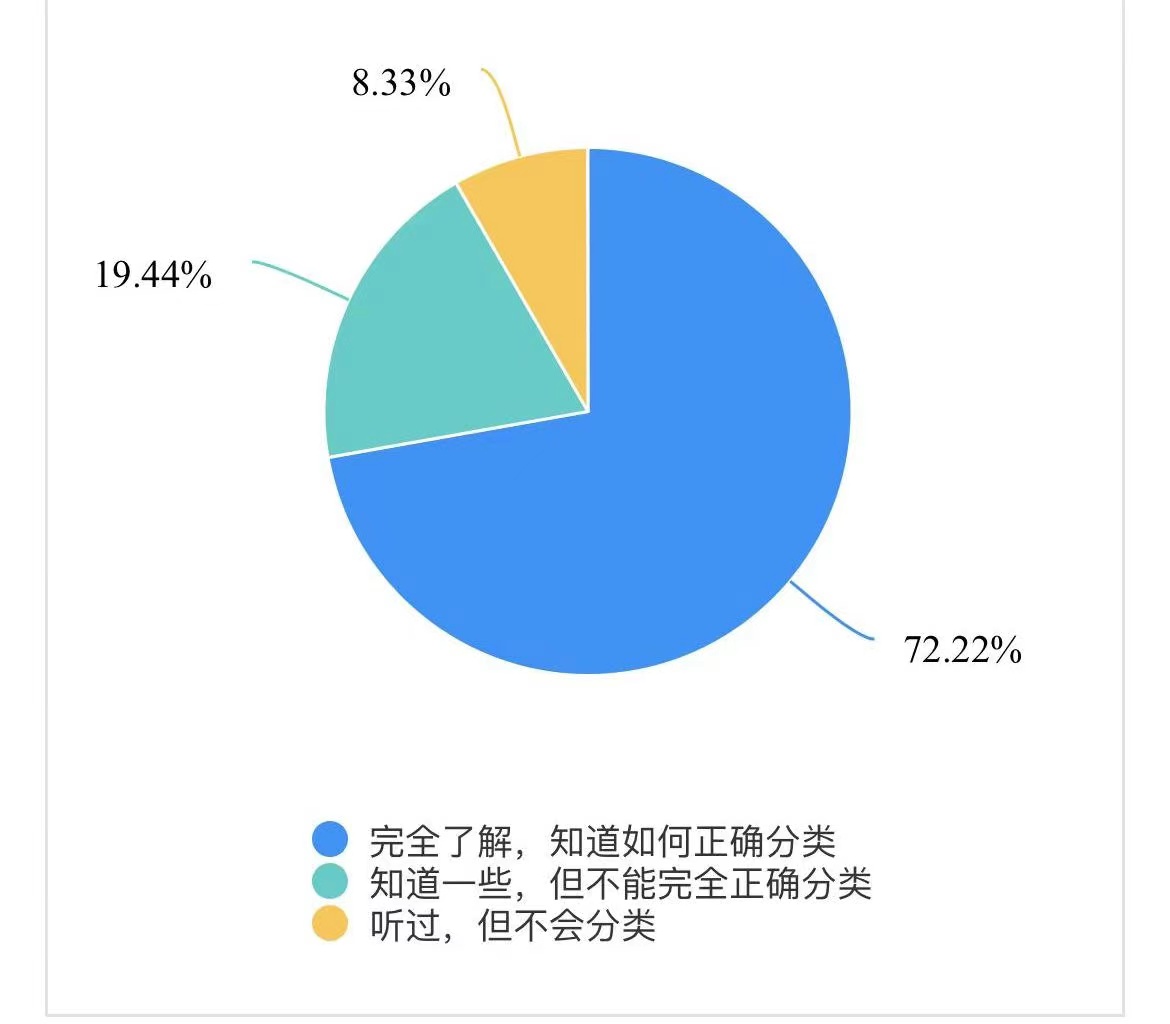 由圖可知居民對于“垃圾分類”這一詞匯都有聽說,但了解的程度如何,居民與居民之間可謂是有些許差距。72.22%的居民完全掌握垃圾分類的知識,并能夠將這些知識靈活運用到日常生活之中,為垃圾分類行動貢獻出自己的一份力量。19.44%的居民可能是在垃圾分類政策的推廣下,自己嘗試學習過垃圾分類小常識,但并不精通,理解也不透徹,因而在生活中也不能正確運用。不過我們當承認的是這類群眾是垃圾分類行動中的“潛力股”,只要加以引導強化,就可以為垃圾分類行動“添磚加瓦”。可惜的是,即使在垃圾分類這個社會大浪潮下,還是有8.33%的居民對如何進行垃圾分類感到陌生與迷茫。針對這類群體,團隊成員及社會工作者需要加大對其的宣傳督促力度,推動其認真學習相關知識,鼓勵其也為改善家園環境出一份力。