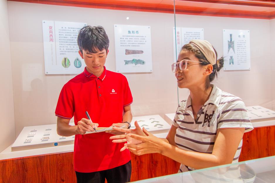 圖為實踐隊隊員李浩與東營歷史博物館講解員交流 任鑫攝