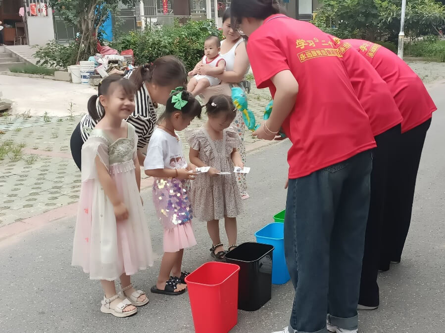 為深入落實共建美麗中國理念,實踐團隊員們開始深入小區,清理小區中出現的小廣告。隊員們先是詳細記錄了小區內存在的小廣告數量、種類和位置等信息,并進行拍照和錄像作為證據,隨后便向小區物業反映了這一情況,并提出預防小廣告滋生的一些建議,如加強安保巡邏,定期巡查小區各個角落,特別是公共區域和墻壁,尋找并記錄存在的小廣告。再比如設置監控攝像頭,在小區關鍵位置安裝監控設備,以便及時發現和阻止小廣告的發布行為,并保障相關證據收集。還有加強宣傳教育,廣告危害的認識,倡導文明社區意識,避免發布和支持小廣告。接著,實踐團開展“垃圾分類我知道”的小游戲,路過的青少年,小朋友在家長的陪同的情況下紛紛參與游戲。成員們給每個小朋友分發印著不同垃圾圖示的小卡片,并準備了四個標有四種垃圾類型的垃圾桶,讓小朋友們自主辨別垃圾種類并投入相應的垃圾桶內。借此提醒和宣傳垃圾分類的知識,提升居民和青少年垃圾分類意識。在游戲的最后,實踐團 成員們還為小朋友們每人送上一個小禮物以示鼓勵。