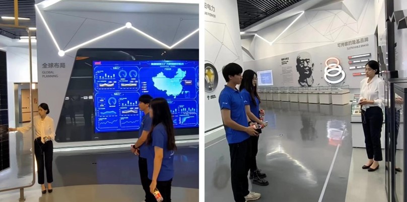 隨后,在隆基綠能樊洋平老師的帶領(lǐng)下實踐隊員們參觀了總部園區(qū)內(nèi)的隆基綠能智慧能源展覽館。展館囊括了從單晶硅片制造到光伏電站系統(tǒng)的太陽能光伏全產(chǎn)業(yè)鏈的各個環(huán)節(jié),展示了隆基在每個環(huán)節(jié)的專業(yè)能力和領(lǐng)先技術(shù)。通過全景投影、互動屏幕等多種手段,實踐隊員們對隆基產(chǎn)品在實際應(yīng)用中的效果和可行有了深入了解。