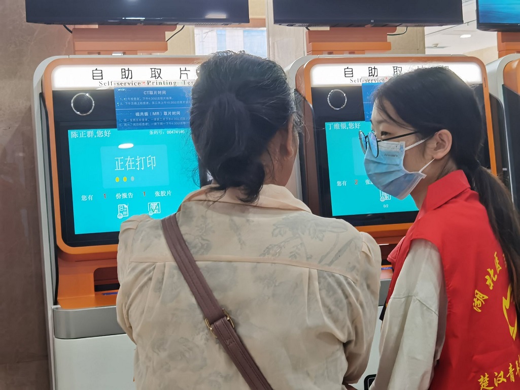 圖為楚漢青年志愿隊(duì)隊(duì)員給患者講解機(jī)器使用,提供導(dǎo)診服務(wù)。通訊員 黎運(yùn)鋒 攝