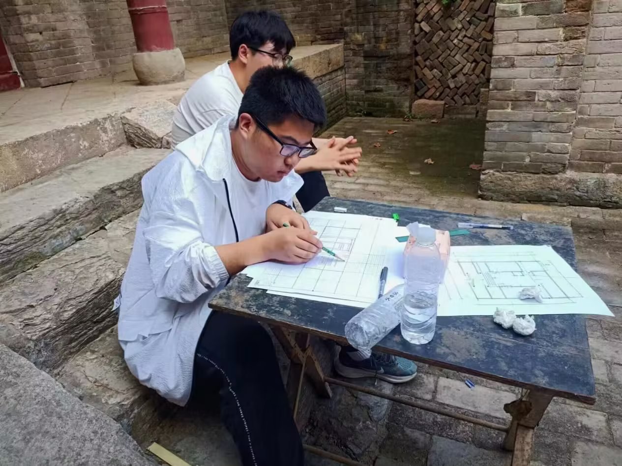圖為實踐隊員在典型院落進行建筑測繪的工作。 曹夢瑤 攝
