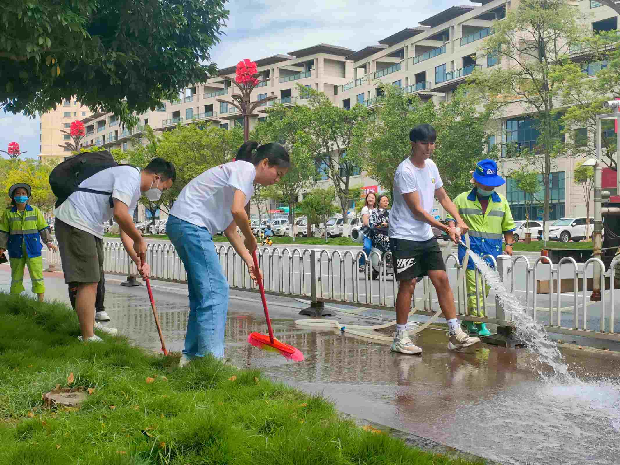 圖為實踐隊員幫助當地清潔工人清洗路面樹葉、塵土,并與其親切交談。