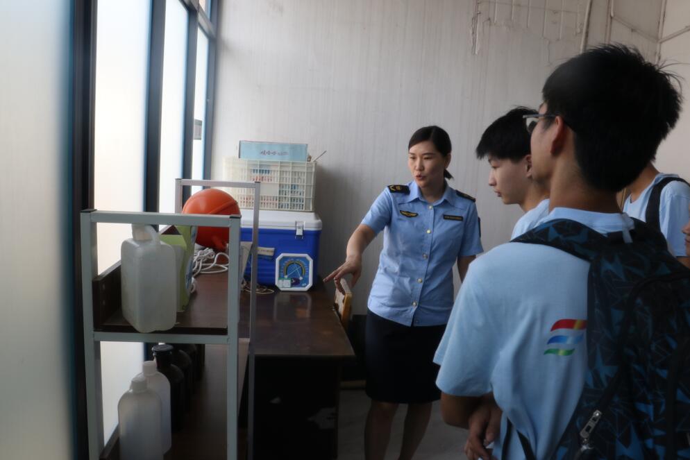 本圖為生態(tài)環(huán)境局監(jiān)測站站長向團(tuán)隊成員介紹環(huán)境監(jiān)測的相關(guān)設(shè)備以及污染物的有關(guān)參數(shù)。