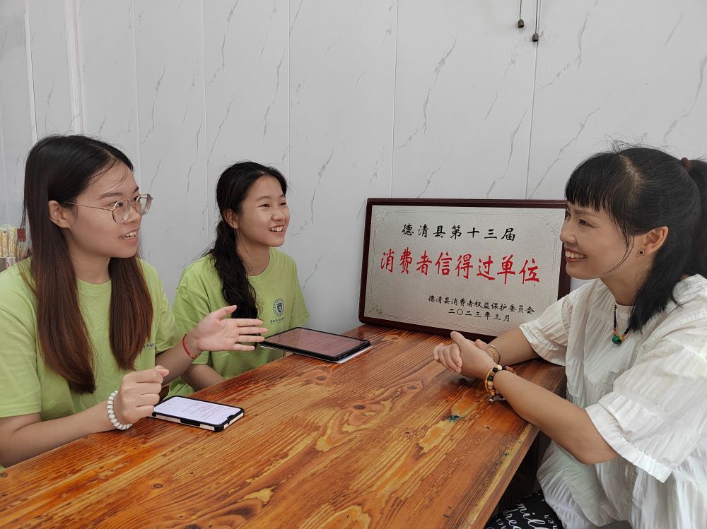 基本熟悉工藝后,實踐隊成員就準備美食改良過程中產生的問題和現場學習萌生的疑問與負責人進行了一對一的采訪交流,店家認真仔細地分享了茶糕制作工序中的關鍵步驟和重點工藝,并表達了對新興傳統手藝人、創業者的鼓勵和期待。過程中,店家表示:“做食品,誠信很重要,質量上一定要把好關,一直堅守初心。”實踐隊成員也將此番話牢記于心。同時,在交流中我們了解到店家在貯藏和銷商上采用了真空包裝和全冷鏈銷售模式,采用線上線下為一體,互聯網+實體企業共發展的新路子,打開了新市茶糕的外銷市場,此種銷售形式,也不失為鄉村振興發展提供了良好的借鑒推廣渠道。在聽取傳統美食制作的工藝學習中,實踐隊成員也帶去了專業性的食品知識幫助解答困擾,彼此互鑒共促共進,在體悟茶糕發展的百年傳承故事和民間創業的心路歷程中,不斷探索傳統美食成功在新時代受到大眾喜愛的奧秘。