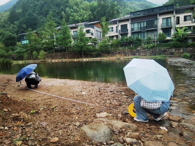 船村溪沿岸也是本次設計的核心點位。在勘測場地之時,正逢綿綿細雨,團隊成員不畏艱苦,通過全數字近景攝影測量技術與卷尺測量相結合的方式獲取數據,通過重復測量得到多組數據,減少數據誤差。團隊成員以嚴謹求實的態度和“三干”精神在丈量點位,盡可能得到準確的數據,做出精準的設計圖,為后期船村項目落地提供更可靠的方案。