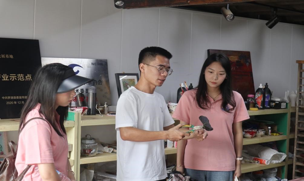 圖為 谷倉畫院林老師向成員介紹漆器工藝 谷倉因文而生,因創而美。谷倉畫院積極為竹里村搭建平臺,引進本土文創產品,為鄉村賦能,為振興添彩。實踐團成員在谷倉畫院學習調研后,更加深刻了解鄉村振興的內涵。