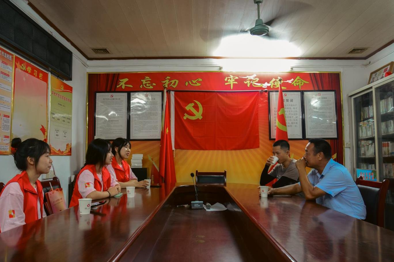 圖為實踐隊隊員向洋光村村書記介紹國家資助和助學貸款政策
