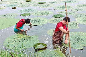 踏香而行,走近煙火在那里,我們遇見了正在水田里為芡實除草的農民阿姨們。毫無疑問,豐收的季節即將到來,龍崗社區的每一個居民都對這些“孩子們”抱有百分之一百的關心與自信。走近與她們搭話,她們熱情地為大家介紹了水田工作,用殷切,關心,與善意溫暖著我們。團隊成員也換上“皮衩子”,體驗水田除草作業。齊腰的水深,粘稠的淤泥,除草工作步步艱難,下水僅僅十多分鐘就已經十分不適。讓我感動的是阿姨們的舉動,她們并未因我們的笨拙而感到拖累,反而熱心地為我們指導,讓我們跟在她們的身后。上岸后,我們團隊無不是氣喘吁吁,但我卻不敢說可以理解農民阿姨們辛苦一早上的疲倦。