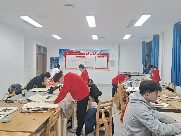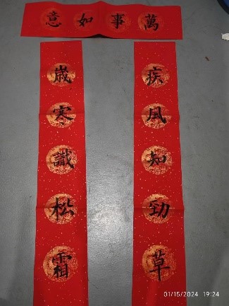 等實踐隊員到達場地后,活動正式開始。首先,指導老師向學生們詳細介紹了對聯的起源、發展及基本規則,引導學生們深入了解對聯文化的內涵。在對聯的創作過程中,學生們熱情高漲,紛紛揮毫潑墨,將內心的感悟化作一幅幅寓意深遠的對聯。有的學生以“梅開五福,竹報平安”表達新年的美好祝愿;有的則以“春風化雨千山綠,秋月凝輝萬家歡”描繪出自然與家的和諧畫面。