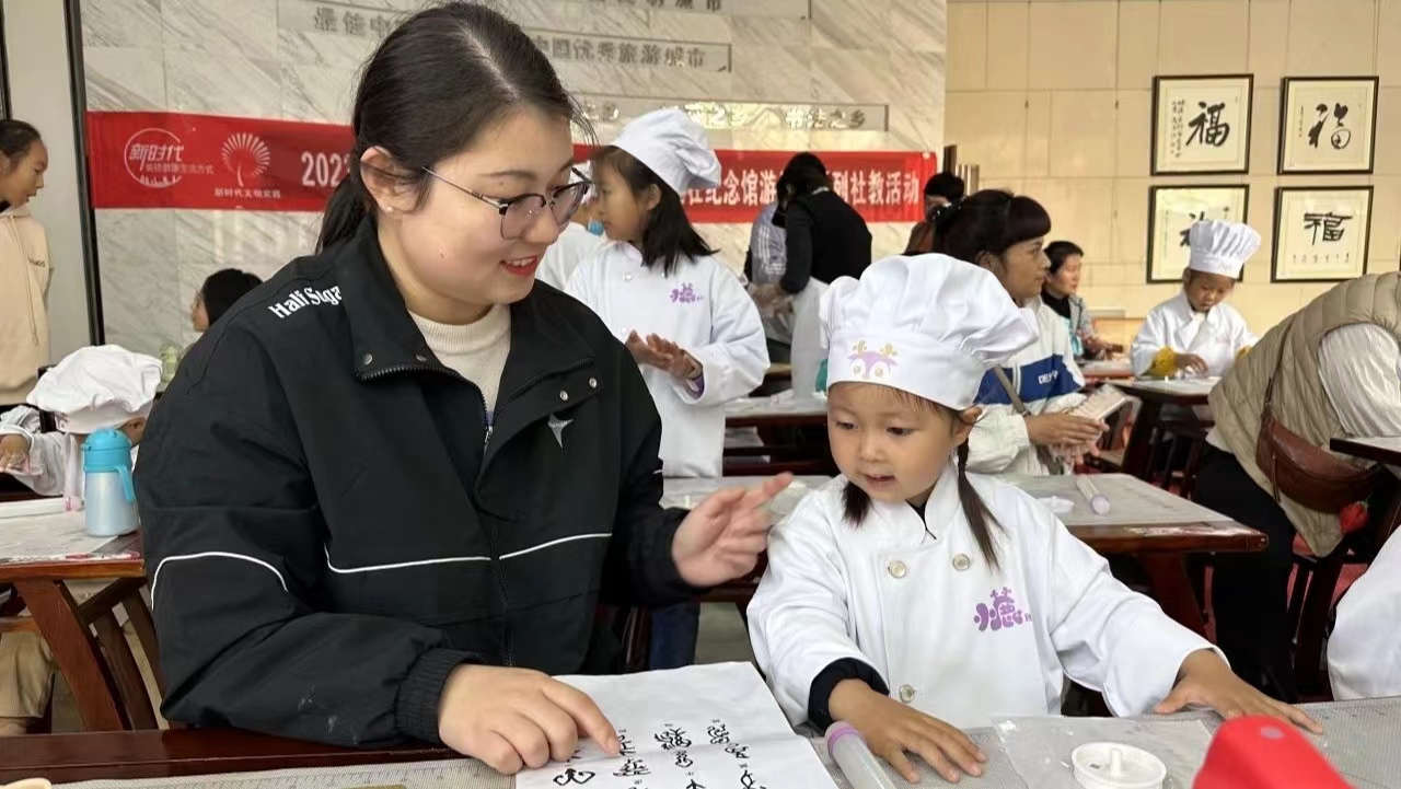 圖為實(shí)踐隊(duì)員指導(dǎo)小朋友制作甲骨文字餅干。中國(guó)青年網(wǎng)通訊員 劉曉 供圖