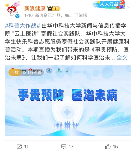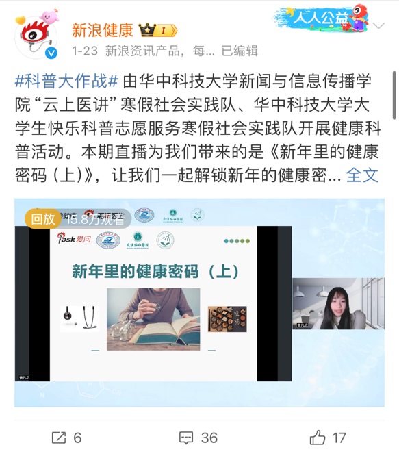 新聞與信息傳播學院“云上醫講”寒假社會實踐隊攜手大學生快樂科普志愿服務寒假社會實踐隊、新浪健康開展線上科普活動