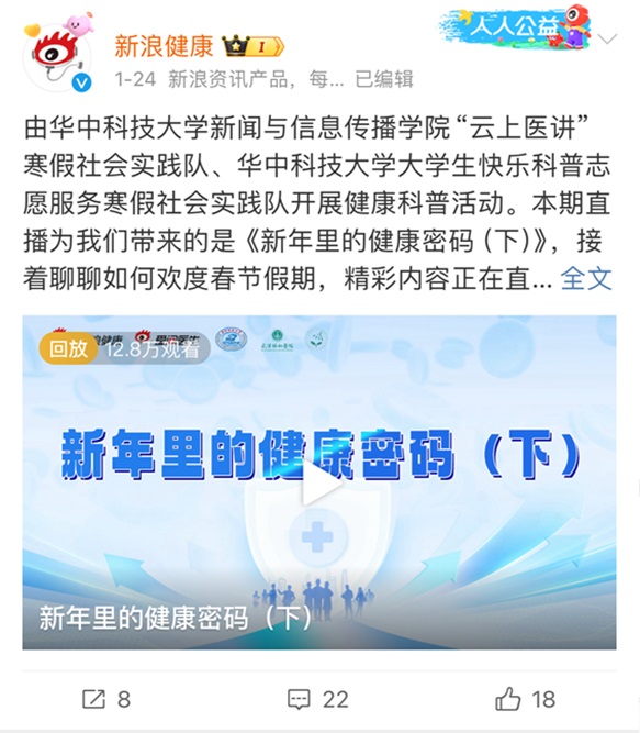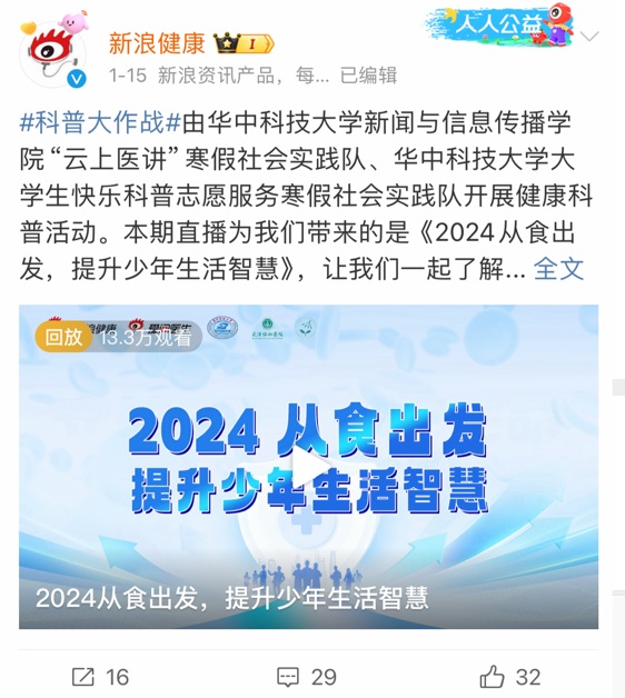 習近平總書記在中共中央政治局第三次集體學習時強調,要加強國家科普能力建設,深入實施全民科學素質提升行動,線上線下多渠道傳播科學知識、展示科技成就,樹立熱愛科學、崇尚科學的社會風尚。為深入貫徹黨的二十大精神,推動科普成果共創共享,形成校園和社會的有效互動,提升全民健康素質,2024年寒假期間,來自華中科技大學新聞與信息傳播學院、基礎醫學院、醫藥衛生管理學院、社會學院、人文學院等多個學院的同學組成的“云上醫講”寒假社會實踐隊,攜手大學生快樂科普志愿服務寒假社會實踐隊,在新浪健康提供的平臺“愛問醫生”微博及微信視頻號上開展線上科普系列講座。