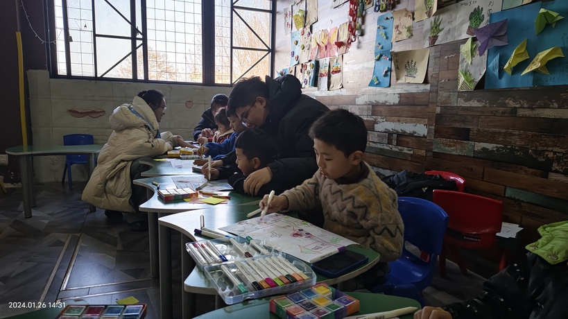 Figure 2圖為實踐隊員在陪伴和引導孩子們作畫。山東大學生命科學學院"以畫療心,撥云開霧" 公益實踐團隊通訊員 李薇 攝。