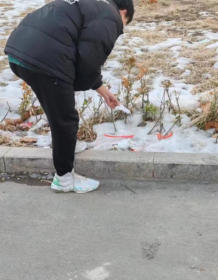 雖然道路上幾乎沒有垃圾,但是在道路兩旁的積雪、草叢中還是有不少紙、塑料袋、煙頭等垃圾,塑料袋等白色垃圾的降解時間長,對環境的污染程度很大,雖然不是很顯眼,但是仔細看還是非常多的,于是一川風月實踐隊隊員便動手撿起了垃圾,也希望社區里的群眾能夠做好本職工作,不亂扔垃圾,創造美麗社區。