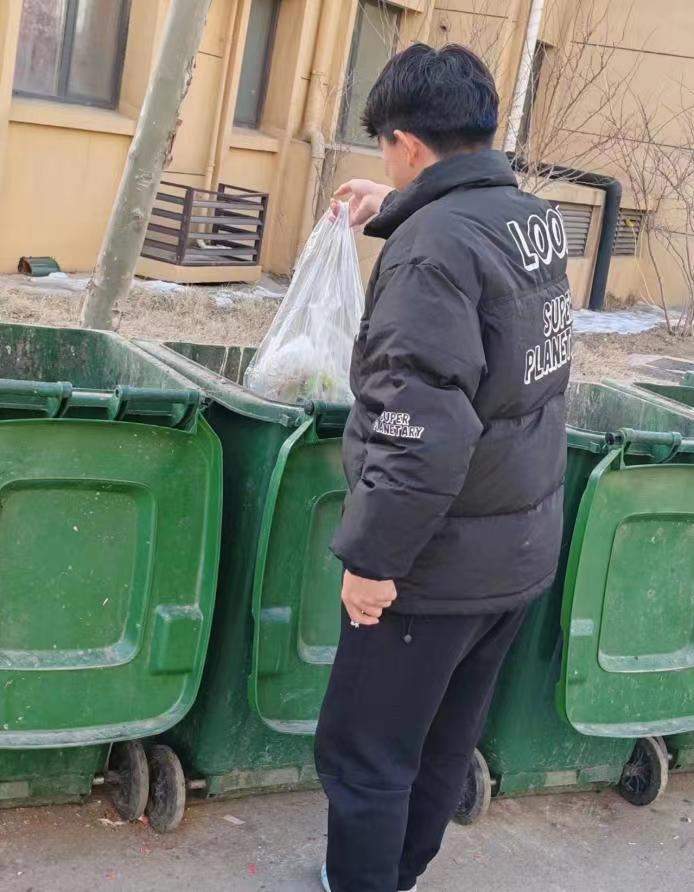 圖為實踐隊員馬奎州在清理垃圾桶周圍垃圾并扔垃圾 中國青年網通訊員 馬奎州 供圖