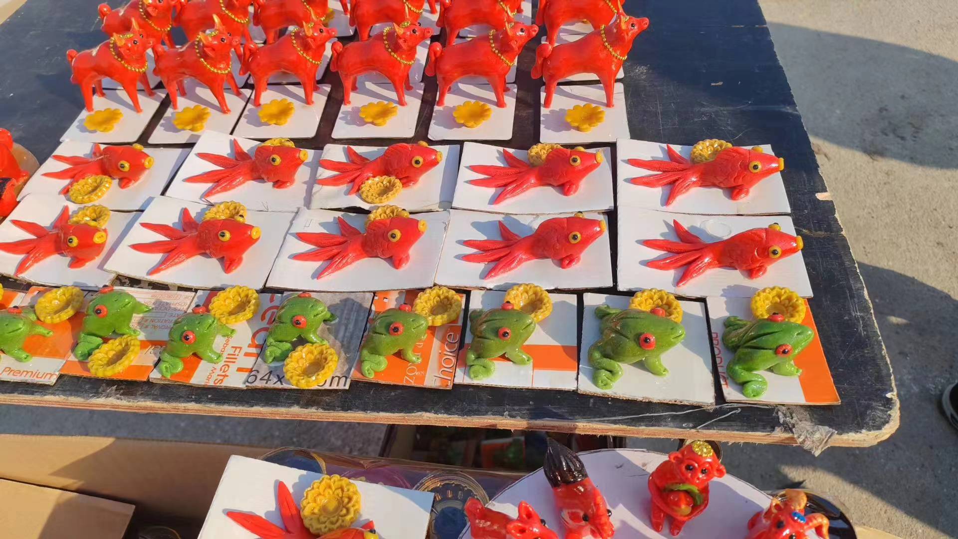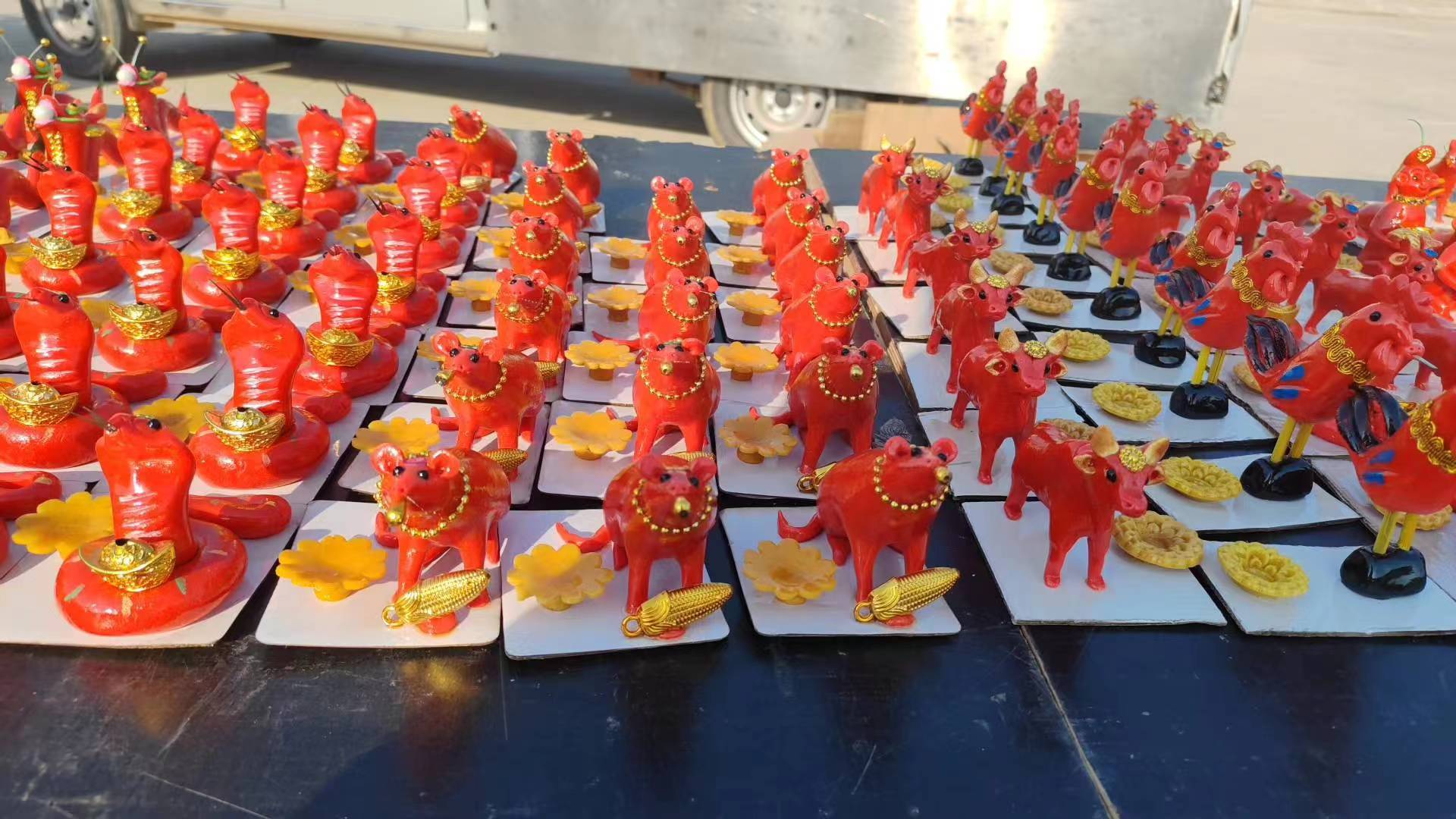用豆面和面成團,加顏料以輔,再經師傅心靈手巧的捏制,一只只活靈活現的小動物就映入眼簾 。最初都是以十二生肖為原型,得到一個個可愛的屬相,如今也會加上象征好運的錦鯉,招財的貔貅。