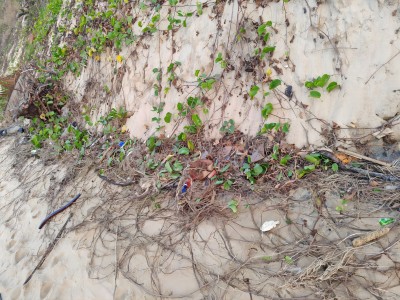調研初期,團隊成員于1月25日抵達怡海灣水口廟附近的沙灘。這片沙灘的特點是靠近入海口、植被覆蓋少、地形平坦、顆粒細膩,且靠近陸地的區域植被茂盛。由于漲潮,沙灘的入口變得狹窄,該時段的人流量也相對較少。整體上,大部分沙灘看起來相當干凈,僅發現少量人為垃圾。然而,在植被覆蓋的區域,卻發現了大量的垃圾殘留,包括塑料瓶、玻璃罐、零食袋、冰糕棍、果皮、漁網、浮標、碎木塊和椰子殼等。