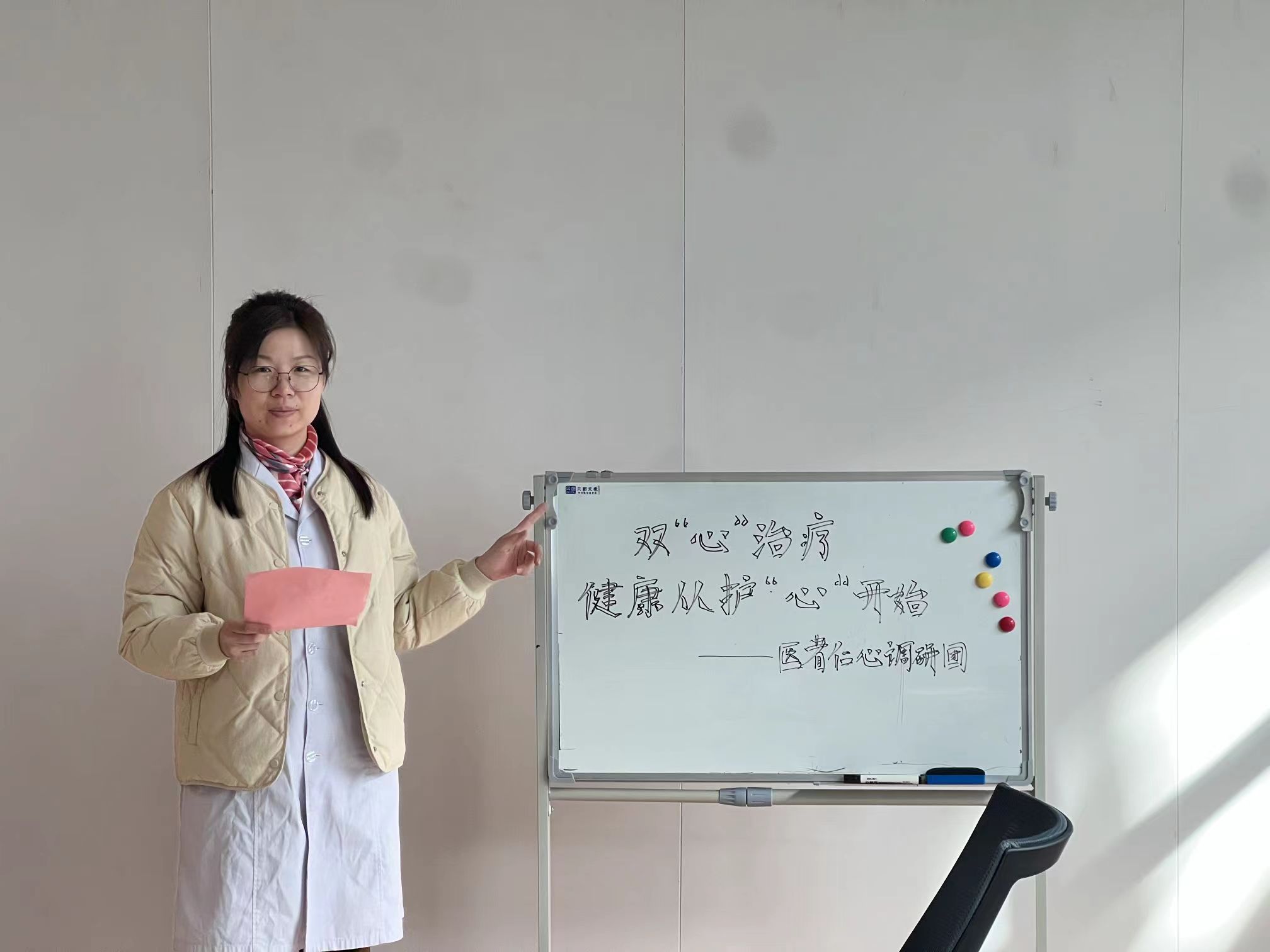 為了更廣泛地普及“雙心治療”的概念,調(diào)研團(tuán)隊(duì)還組織了普通民眾宣講。在濰坊醫(yī)學(xué)院附屬醫(yī)院內(nèi),他們向普通民眾介紹了“雙心治療”的理念和方法,在活動(dòng)現(xiàn)場(chǎng),團(tuán)隊(duì)成員們以生動(dòng)有趣的方式,向民眾詳細(xì)介紹了雙心治療的概念和重要性。他們通過案例分享、圖示講解等形式,讓民眾對(duì)雙心治療有了更直觀的認(rèn)識(shí)此外,團(tuán)隊(duì)成員們還發(fā)放了精心制作的宣傳資料,內(nèi)容涵蓋雙心治療的原理、方法以及常見問題解答。這些資料為民眾提供了更多了解雙心治療的途徑,以及中醫(yī)藥在其中的應(yīng)用。聽眾們對(duì)這個(gè)新穎的治療方式表現(xiàn)出了濃厚的興趣,紛紛提問和交流。