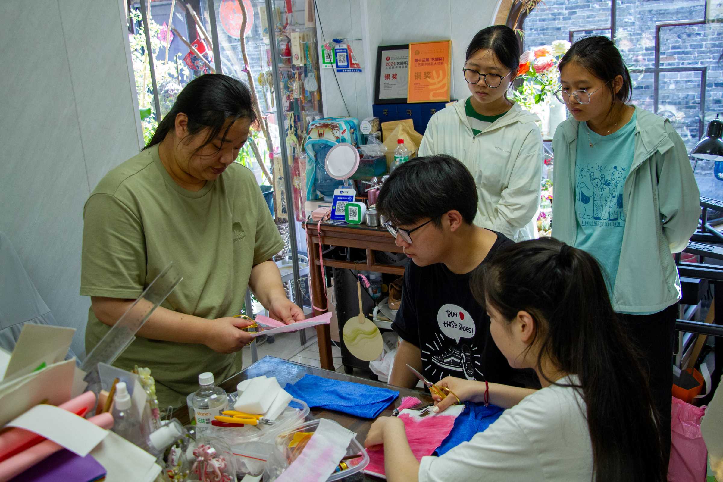 (圖為6月25日,“翰墨華韻揚州行:通草花開,一捻芳華”團隊成員在觀察學習制作通草花。江偉波供圖)