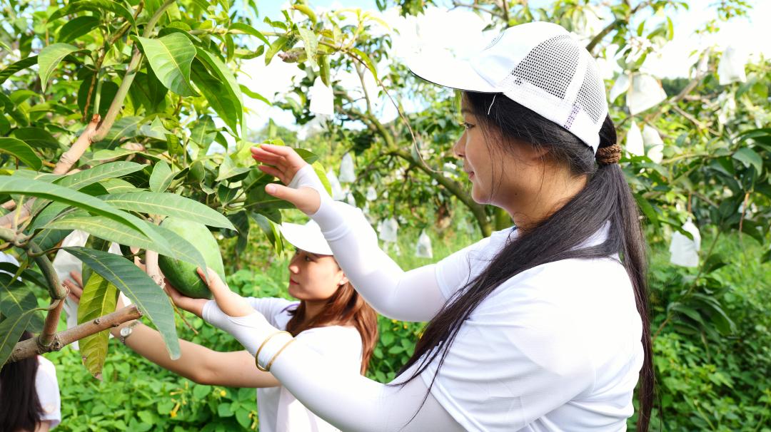 圖為鄉(xiāng)村振興團(tuán)團(tuán)成員在芒果園地進(jìn)行實(shí)地采摘 黃晶 攝