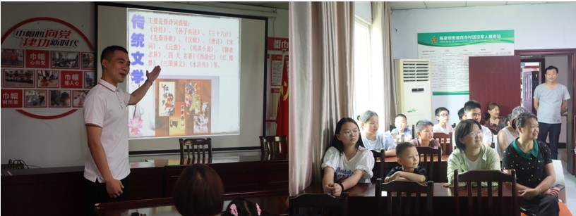 (圖為傳承團(tuán)成員向當(dāng)?shù)鼐用裰v解中華傳統(tǒng)文學(xué))
