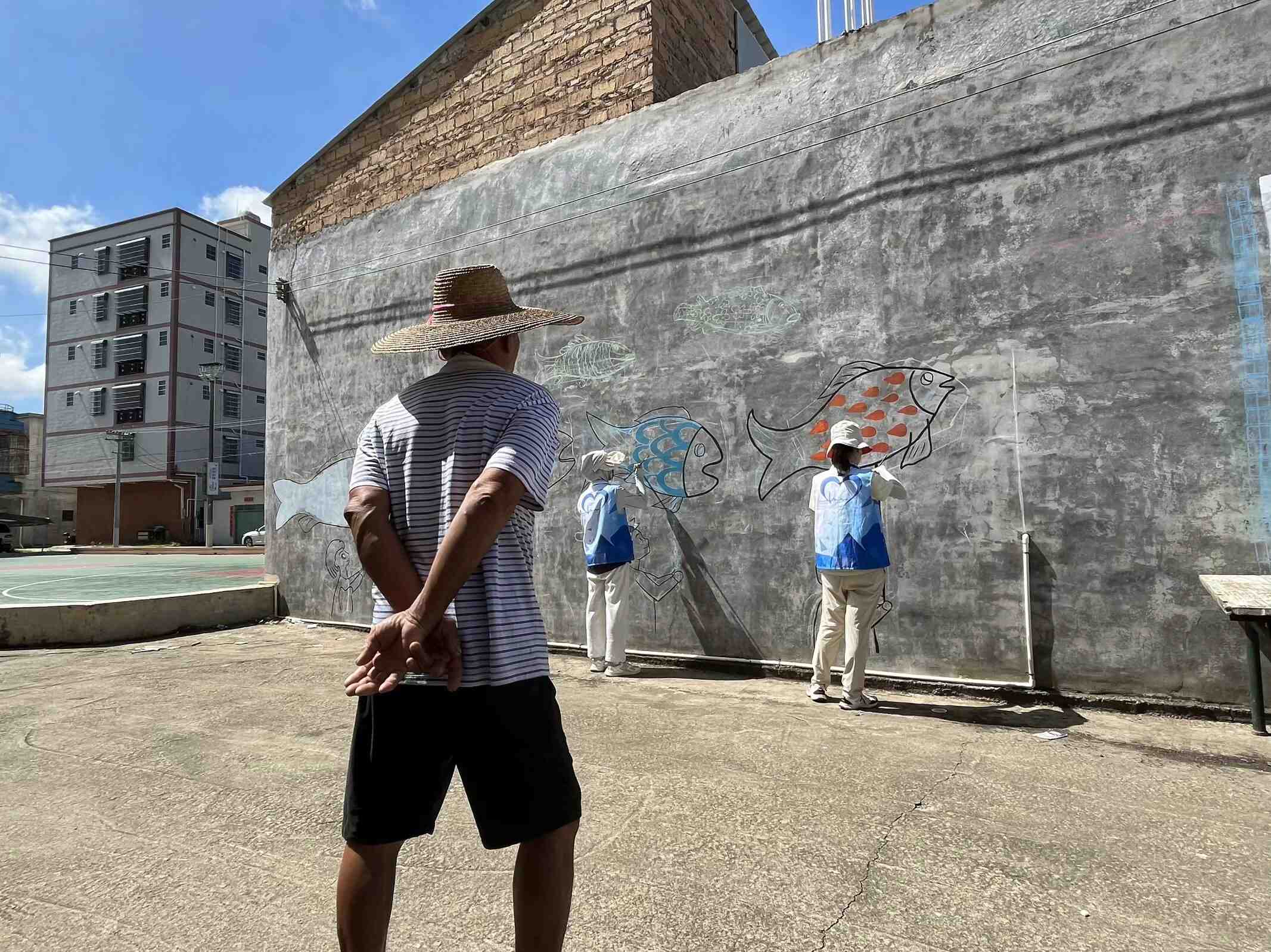 墻繪的制作如火如荼經過三天的工作,墻繪制作已完成大半,一條條栩栩如生的游魚將展示于隊員與村民面前。