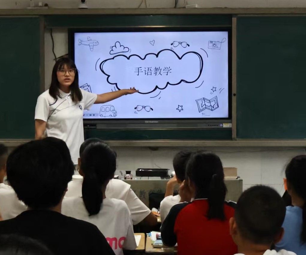 2024年7月8日,漢江師范學院童心童行支教團隊在湖北省十堰市竹溪縣向壩村鄉壩中心小學7-9年級進行了基本的手語教學。