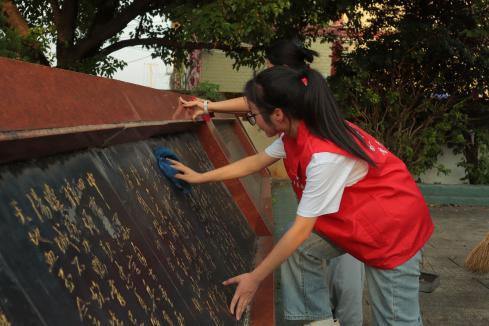 清掃完畢。志愿者們展開團旗,佩戴團徽,由青馬工程骨干班成員羅琳瑯同學領誓,全體志愿者整齊排列于碑前重溫入團誓詞,不忘初心,牢記使命。
