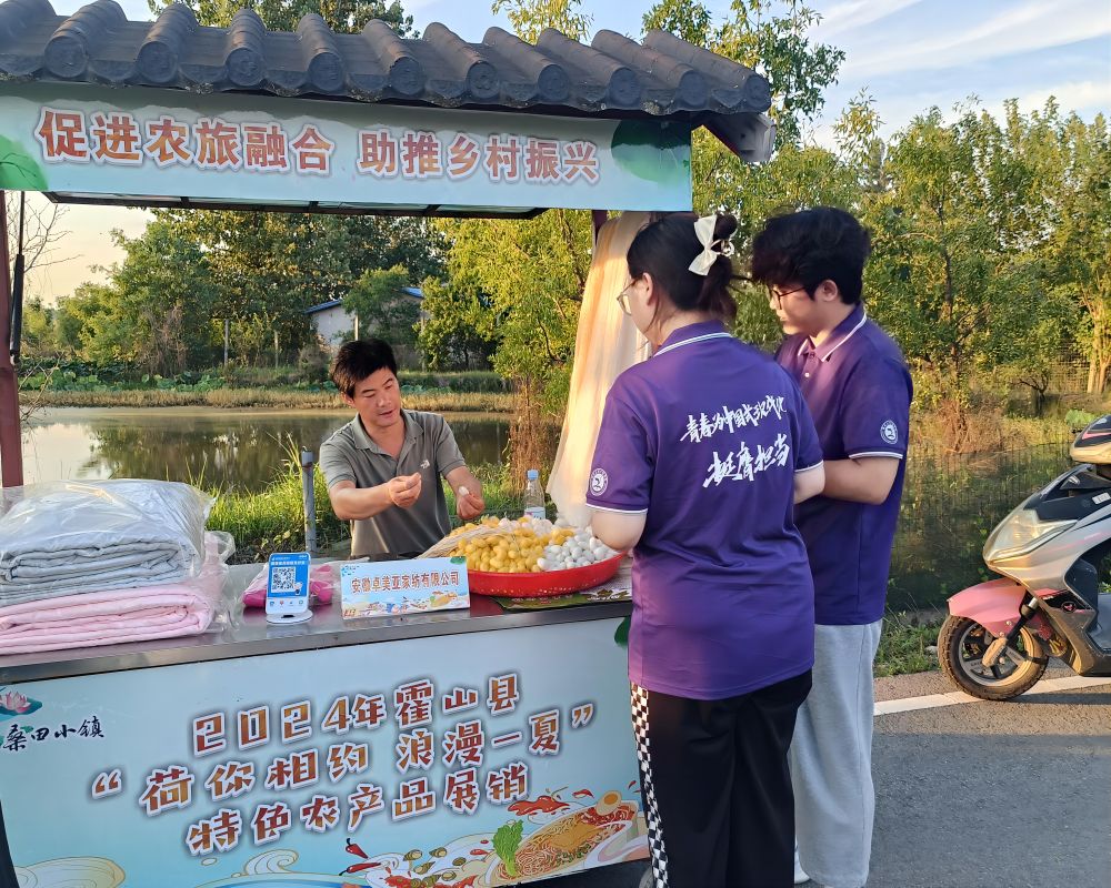 圖為2024年7月4日,團(tuán)隊(duì)成員參與霍山縣“荷你相約 浪漫一夏”啤酒龍蝦嘉年華活動(dòng)特色農(nóng)產(chǎn)品展銷(xiāo)。金思彤供圖