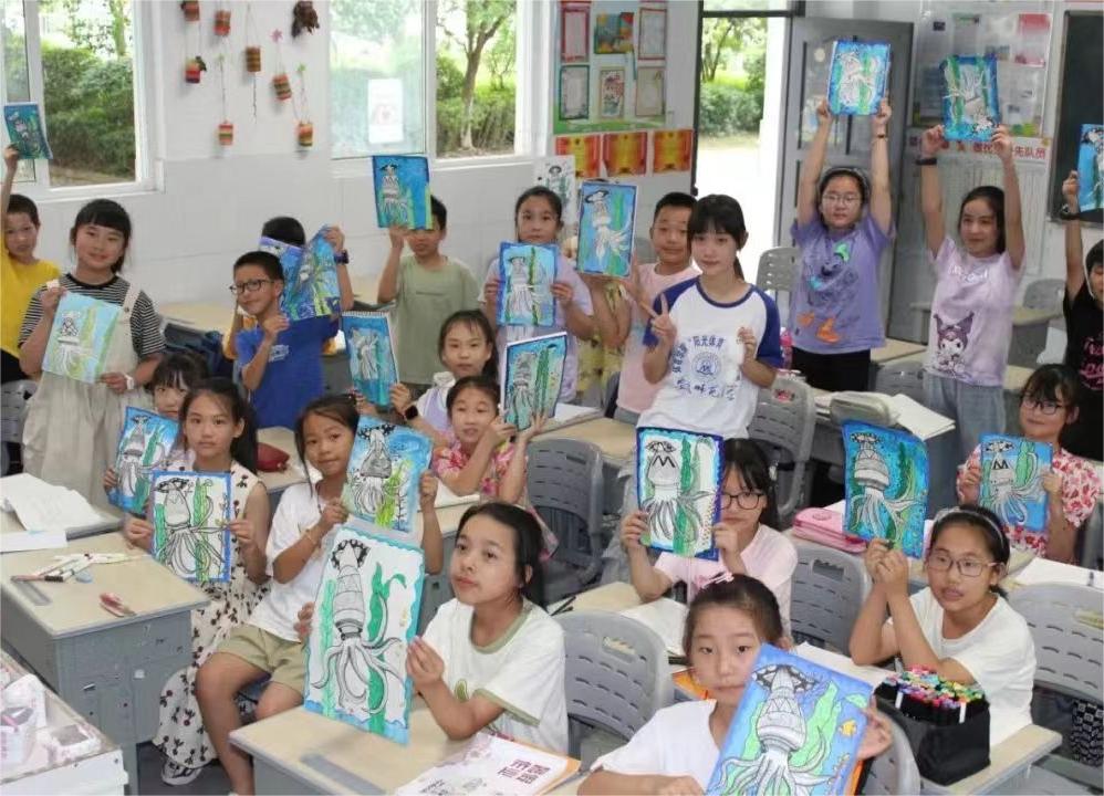 (圖為老師和孩子們紛紛展示美術(shù)作品 吳晶晶攝)