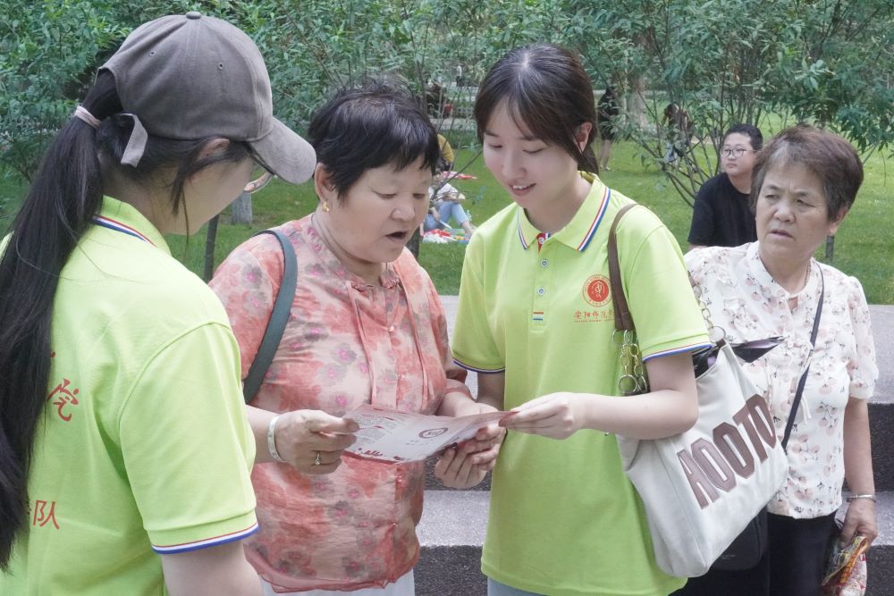 一進(jìn)入公園,隊(duì)員們迅速行動(dòng)起來,向過往的市民發(fā)放普法宣傳資料。除了固定的宣傳點(diǎn),隊(duì)員們還分成了幾個(gè)小組,在公園內(nèi)進(jìn)行流動(dòng)宣傳。他們沿著公園的小徑,向正在散步、鍛煉、休息的市民們發(fā)放宣傳資料,講解法律知識(shí)。遇到對(duì)法律感興趣的市民,隊(duì)員們就停下來,與他們深入交流,解答他們的疑問。在湖邊的亭子里,張曉月、李藝佳等隊(duì)員與幾位老人圍坐在一起,為他們講解了老年人權(quán)益保障法和繼承法等相關(guān)法律知識(shí),老人們聽得津津有味,不時(shí)點(diǎn)頭表示贊同。此外,隊(duì)員們的普法內(nèi)容涉及《中華人民共和國反電信網(wǎng)絡(luò)詐騙法》。在普法的過程中,有一位叔叔表示:“這些知識(shí)我基本上都了解了,現(xiàn)在街上很多地方都貼有這種反詐騙的宣傳海報(bào)”。誠然,近年來我國對(duì)于反詐騙的法律知識(shí)進(jìn)行了大規(guī)模普及,只是電信詐騙花樣層出不窮,隨著全民反詐意識(shí)的增強(qiáng),電詐分子編寫詐騙話術(shù)的能力也在不斷升級(jí)。因此,防范詐騙仍然不可掉以輕心。