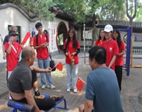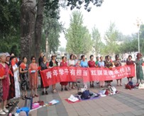 宣講結束后,在公園的一隅,團隊成員與已經提前聯系過的安陽歡歌藝術團共同合唱了紅色革命歌曲《推車歌》《定叫山河換新裝》等歌曲,在場人員共同合唱這幾首歌曲,稚嫩的、鏗鏘的聲音融為一體,大家眼前仿佛看見了林縣的青年人、老年人和婦女共同支援前線、修筑紅旗渠的畫面,所有人心心相印、沆瀣一氣,為了大家的生存而奮斗著。