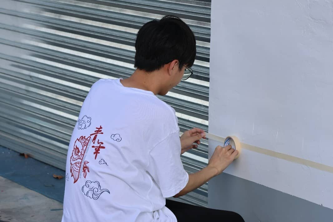 嶺南青年實踐團隊員用紙膠帶劃定墻繪區域