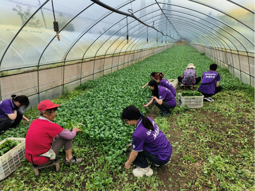 隨后,團隊成員們來到青菜種植大棚,幫助農戶們采摘青菜。跟隨著農戶們的示范,成員們小心翼翼地握住青菜根部,輕輕一提,便成功完成了一棵青菜的采摘。他們干勁十足,不怕辛苦,不怕臟累,在實踐活動中相互協作、互相幫助,共同完成蔬菜園的各項種植任務,增進彼此友誼的同時,用自己的雙手為蔬菜園增添了一份生機和活力。