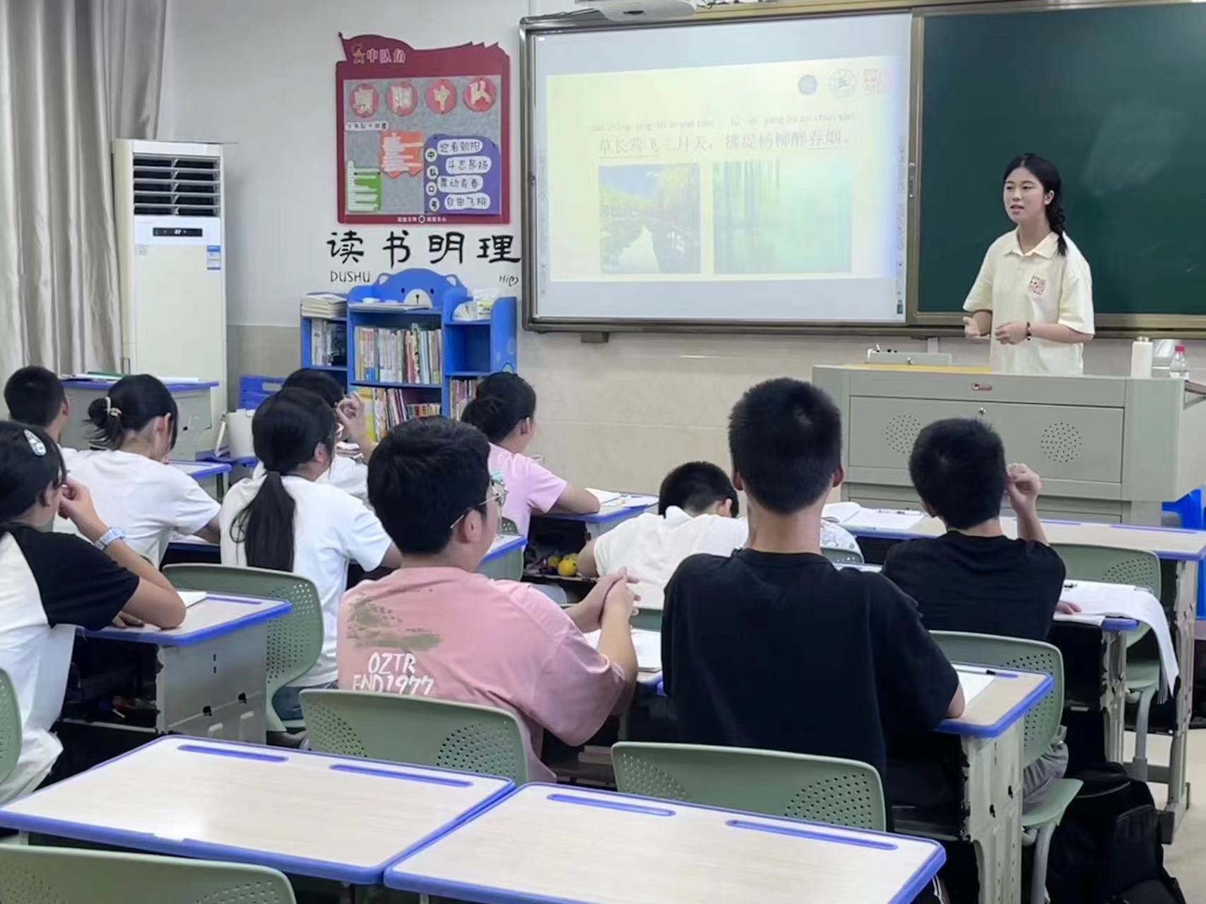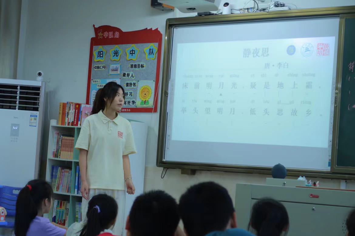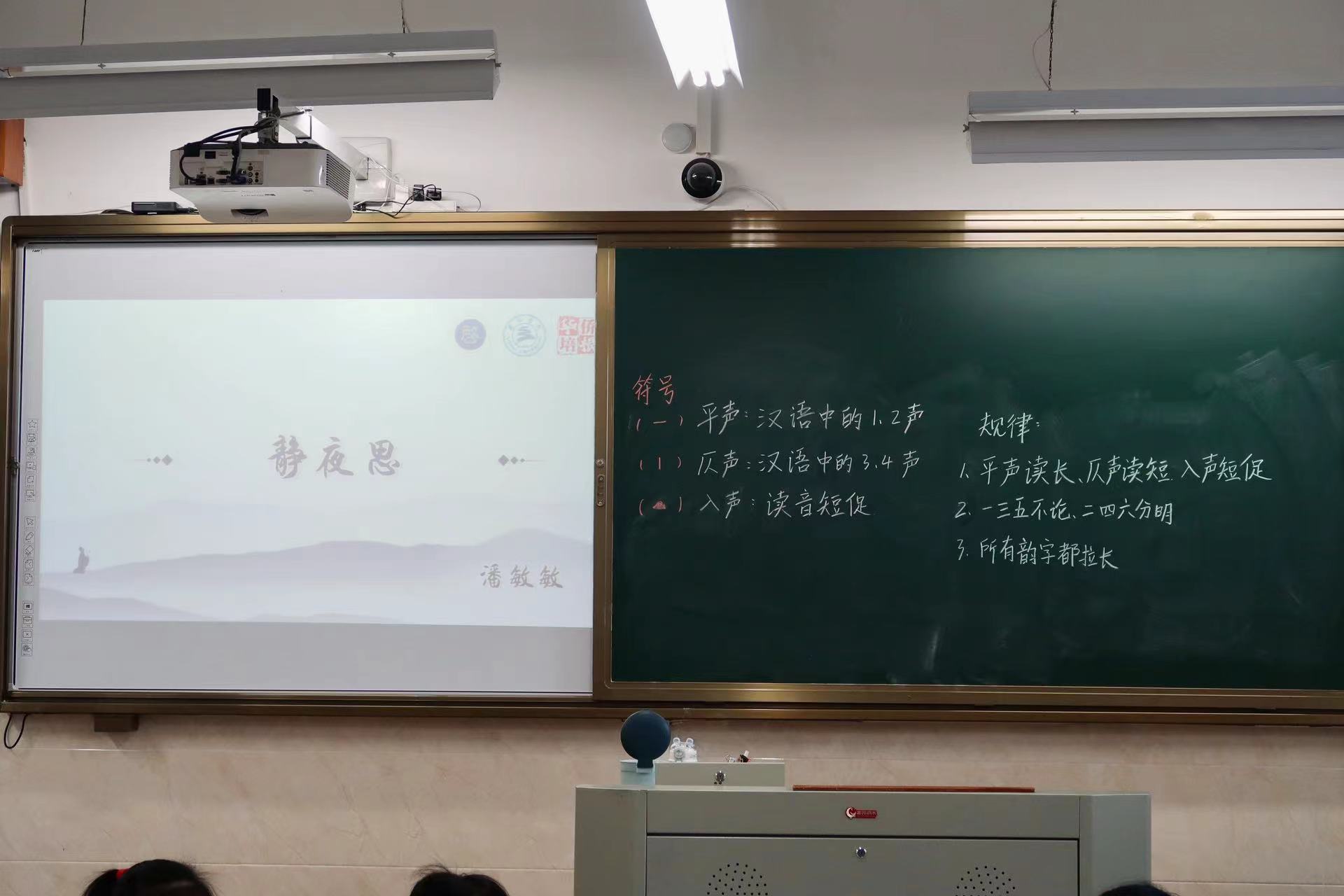 我們根據各個年級的實際狀況和學習水平,分配所教的內容,如一年級教授《詠鵝》、五年級教授《望廬山瀑布》等。在課程中,團隊成員運用PPT講演的形式,結合通俗易懂的語言,先為同學們介紹古詩的寫作背景、作者,講解詩句的意思,讓同學們更好的理解所講的古詩,待同學們熟悉古詩后,再教同學們去吟唱。