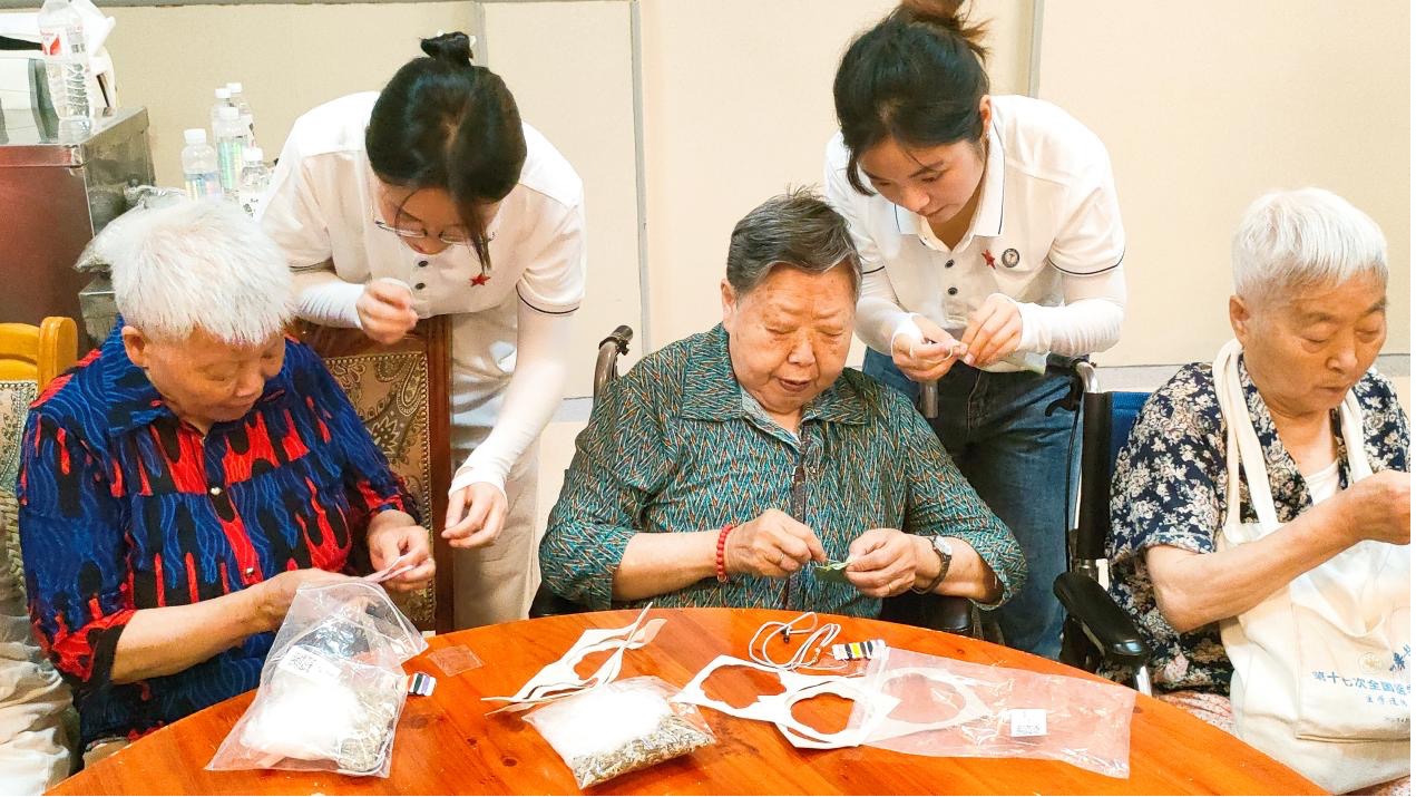 互動環(huán)節(jié)中,川北醫(yī)學(xué)院與江蘇師范大學(xué)科文學(xué)院的志愿者們共同陪老人制作手工藝品,當(dāng)一個個美麗的艾草包制作完成后,老人們臉上都洋溢著幸福的笑容,其中一位奶奶非常開心地把艾草包掛在脖子上并說:“這是我時隔幾十年再做手工針線活兒,雖然眼睛看不太清楚啦,但是手藝還是在呢”。活動現(xiàn)場充滿了歡聲笑語,此次“一東一西”兩校聯(lián)動志愿活動,不僅增進(jìn)了兩校之間的友誼,更讓敬老院的老人們感受到了社會的溫暖和關(guān)懷。它如同一場友誼的接力賽,將兩代人的心緊緊相連,共同譜寫了一曲敬老愛老的時代贊歌。