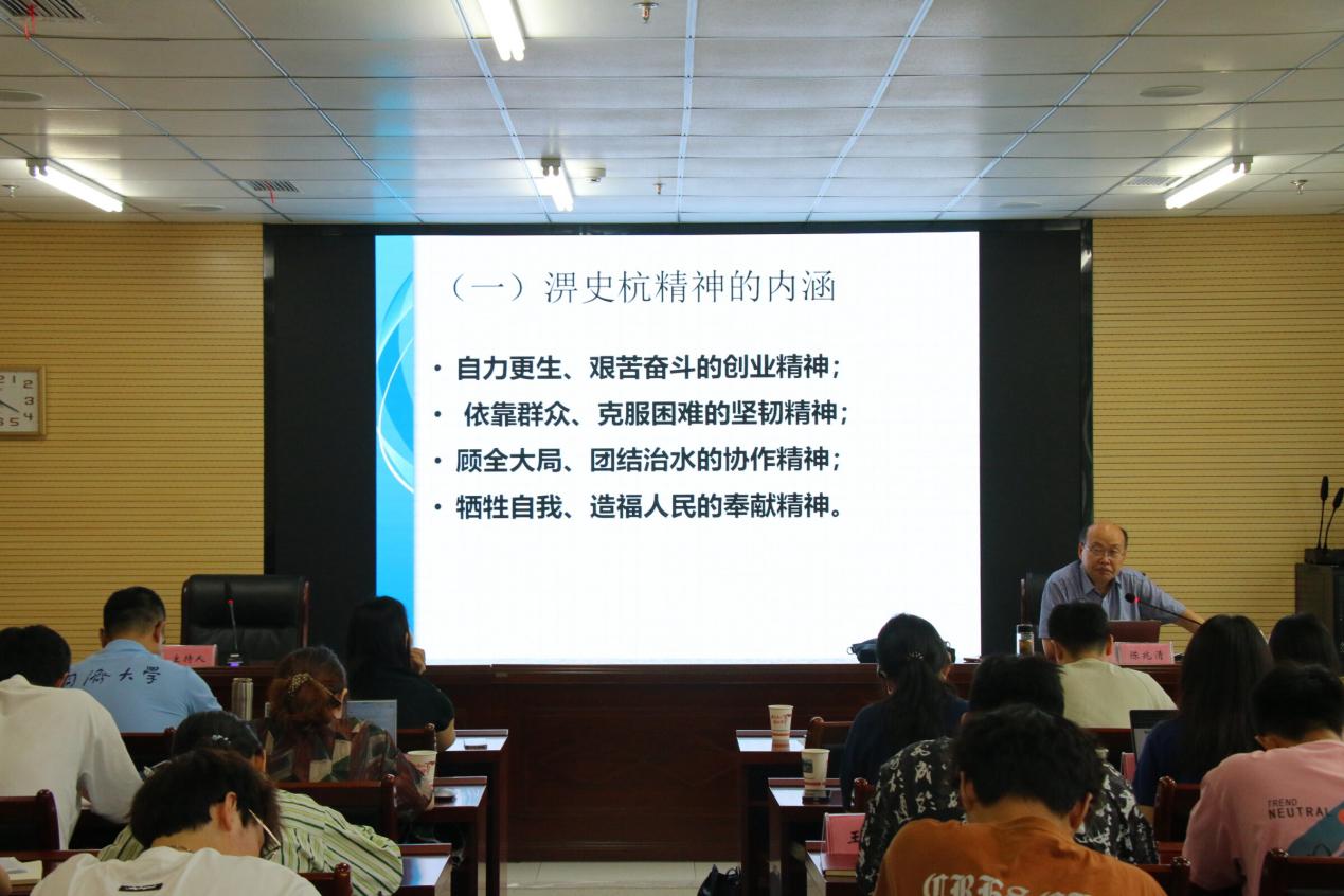 緊接著,陳兆清老師詳細講述了工程建設中的感人故事。學習英雄人物和英雄群體:淠史杭工程建設過程中涌現出“劈土法”發明者劉美三、爆破能手馮克山,壽縣女英雄呂樹美、以程國芬為營長的“婦女野戰營”等英雄群體。他們舍小家、為大家,無私奉獻,為了工程的順利推進付出了巨大的努力。有的甚至獻出了寶貴的生命,他們的英勇事跡讓在場的同學們深受感動。