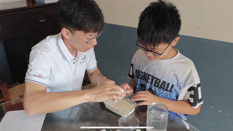 在前往支教前,團隊成員準備了電路元器件,各種化學材料實驗試劑和物理實驗模具等物資,設計了電路組裝課,材料實驗課,物理實驗課,生命安全科學課等。前往目的地,實踐團成員先后來到東蓮村和西蓮村,在學生家中開展送教入戶活動,小小的實驗推開了孩子們探索奇妙科學世界的大門,在實驗過程中,志愿者向孩子們介紹了實驗相關器材,帶領孩子們親自動手組裝電路并觀察實驗現象,配置非牛頓流體并感受它的特性,了解生命安全科學的基本概念,觀察水吸乒乓球等新奇的物理現象。一個個不同的實驗現象激發了同學們對科學真理的熱情。同學們從一開始的緊張局促、不太熟練,逐漸變成了得心應手,喜歡上了親自動手實驗的感覺。